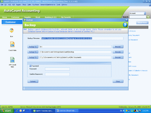 It is advisable that you backup and restore your data frequently in the case that you may lose your data. AutoCount Accounting provides you strong and reliable backup support. You can backup your data with password protection to ensure data security. In multi-user network environment, you can backup / restore your data without requiring other users to logout from the system.
